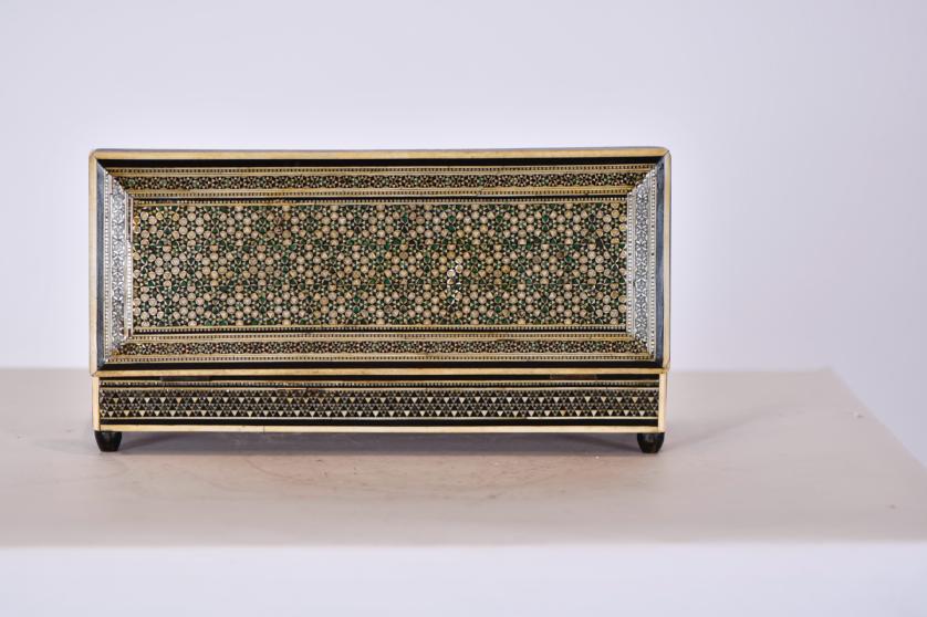 En madera con nácar y hueso. Decorada con micro mosaico.