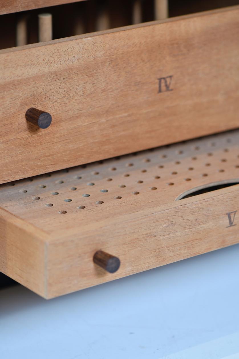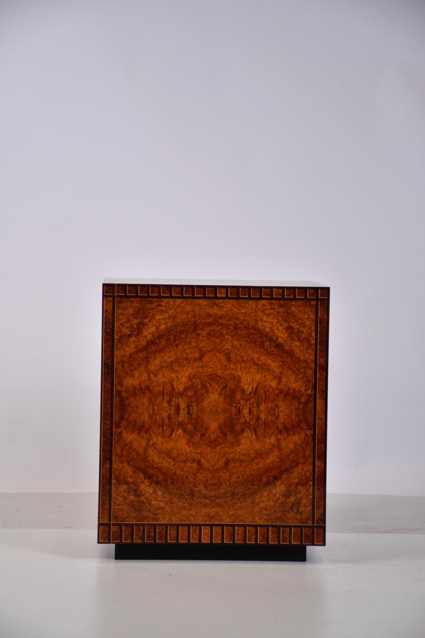 Exterior con marquetería pictórica con la representación de un trampantojo en el frente de las puertas, realizada con maderas de raíz. Interior dispuesto con cajones de fresno.