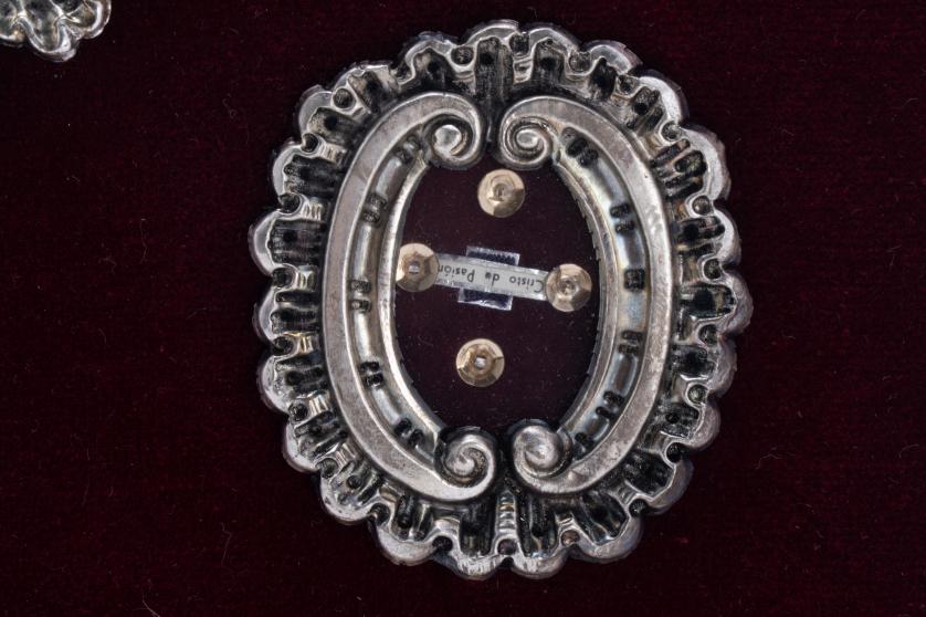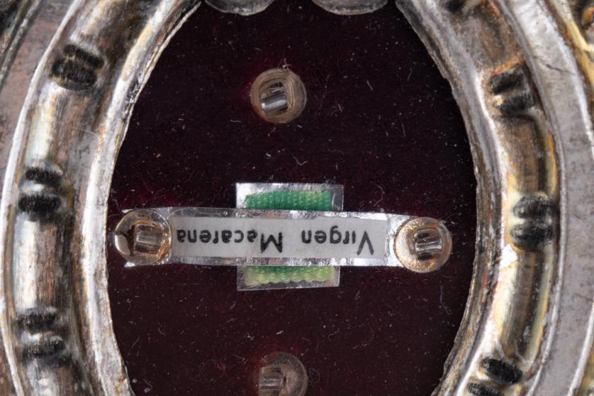 Con reliquias del Cristo de la Pasión, Virgen de la Macarena y Virgen de los Royes y Virgen del Rocía de enmarcadas en plata y metal plateado.