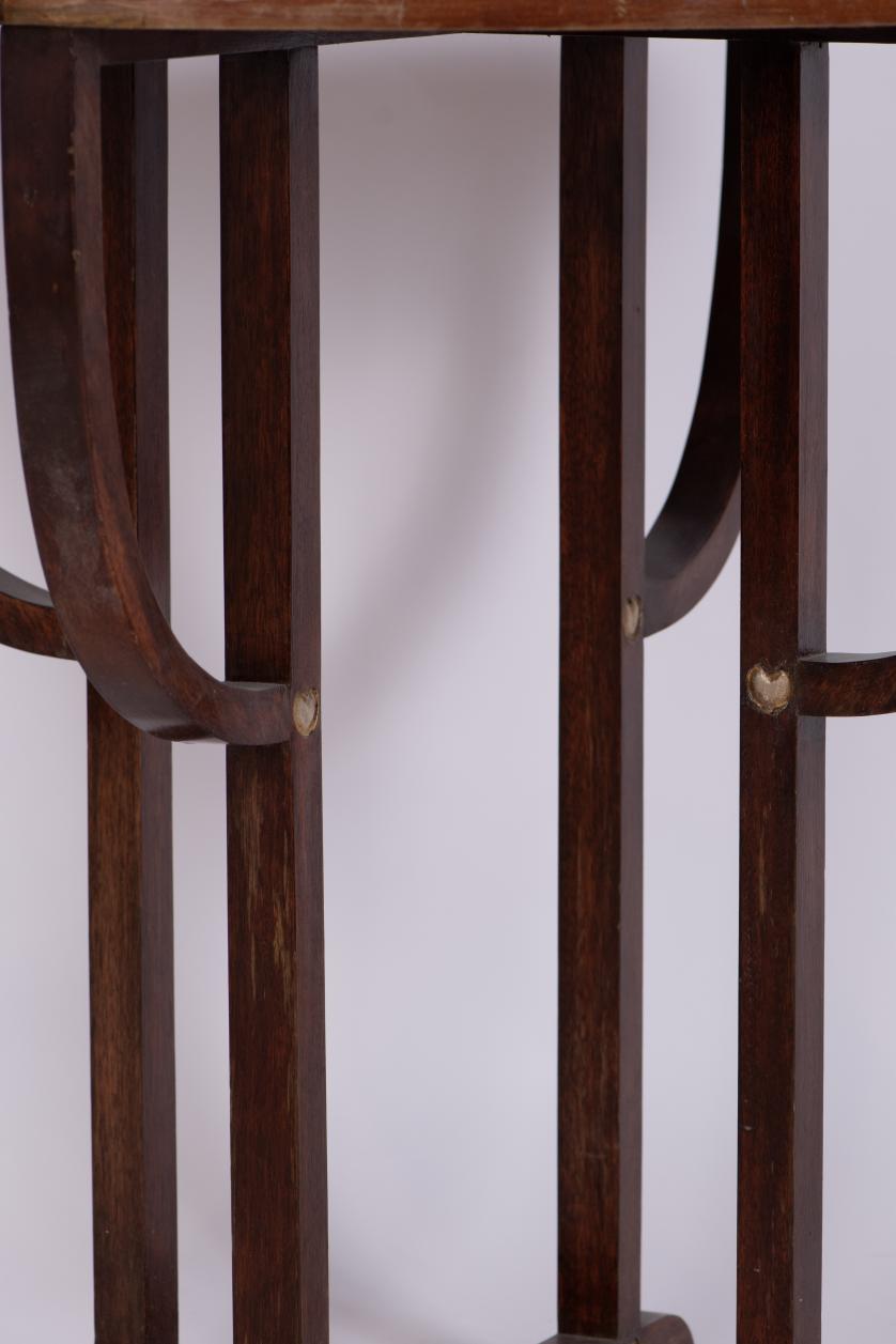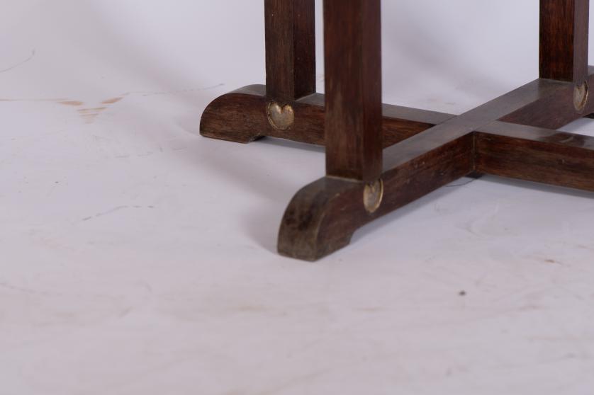 En madera de nogal y aplicaciones en marquetería de maderas finas y metal.