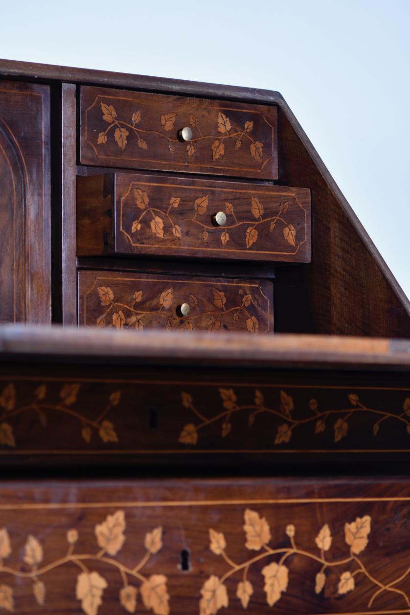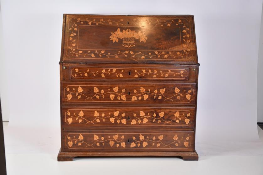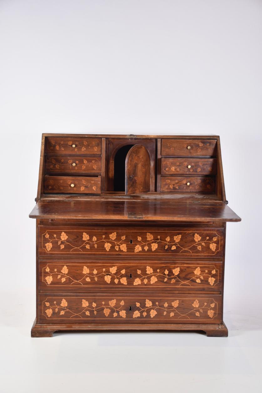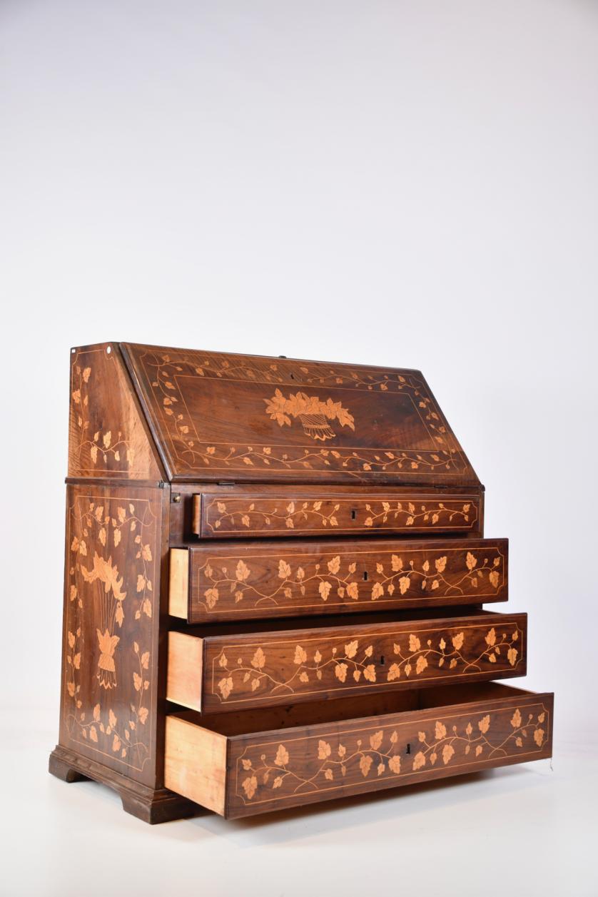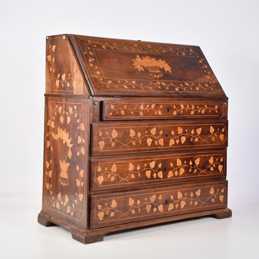 En madera de nogal con marquetería de maderas finas y herrajes en latón.