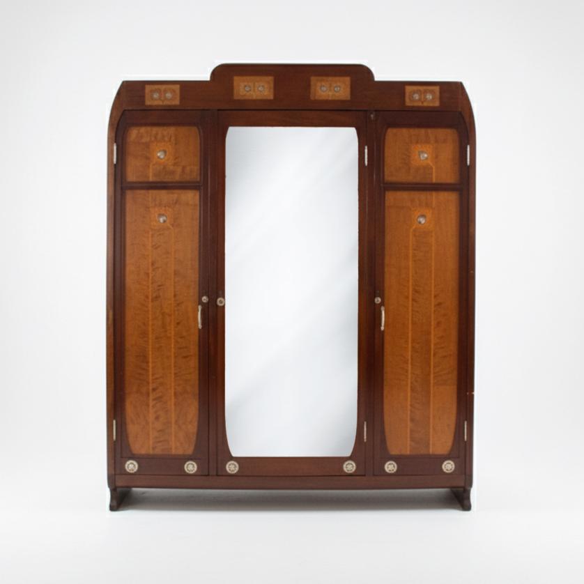 En madera de nogal y aplicaciones en marquetería de maderas finas y metal. Gran luna en cristal biselado en la puerta central.