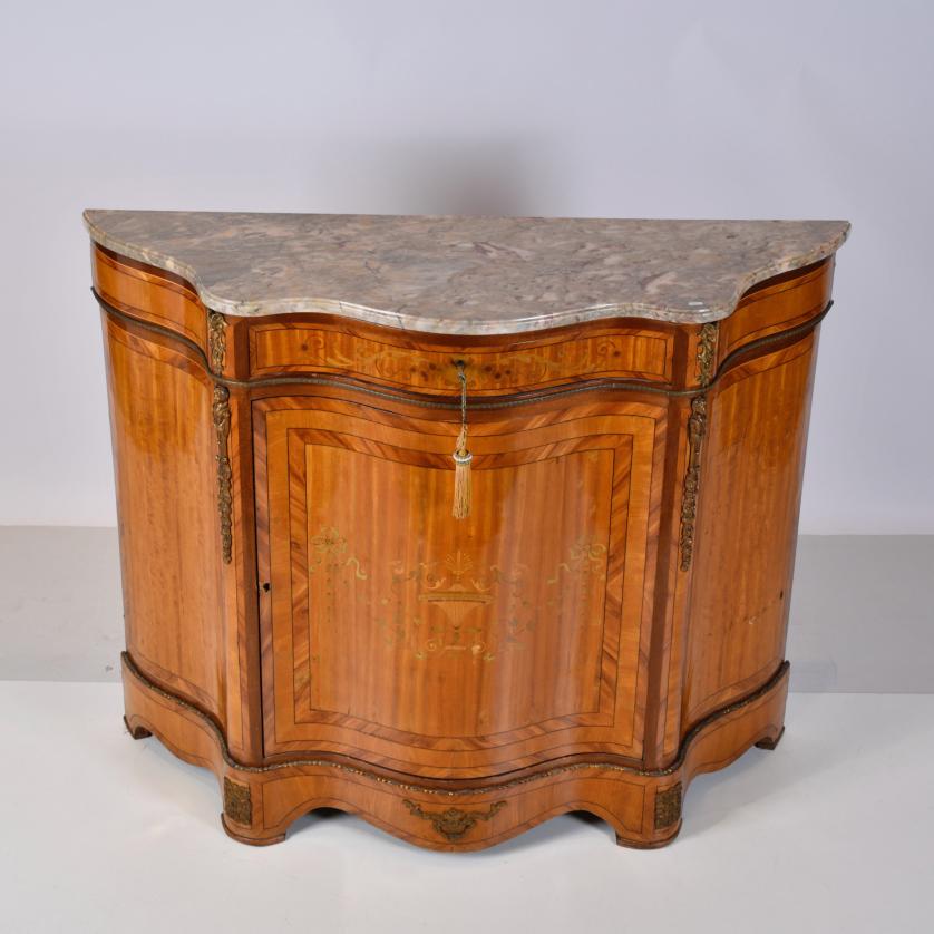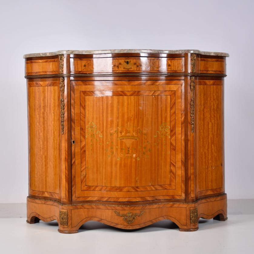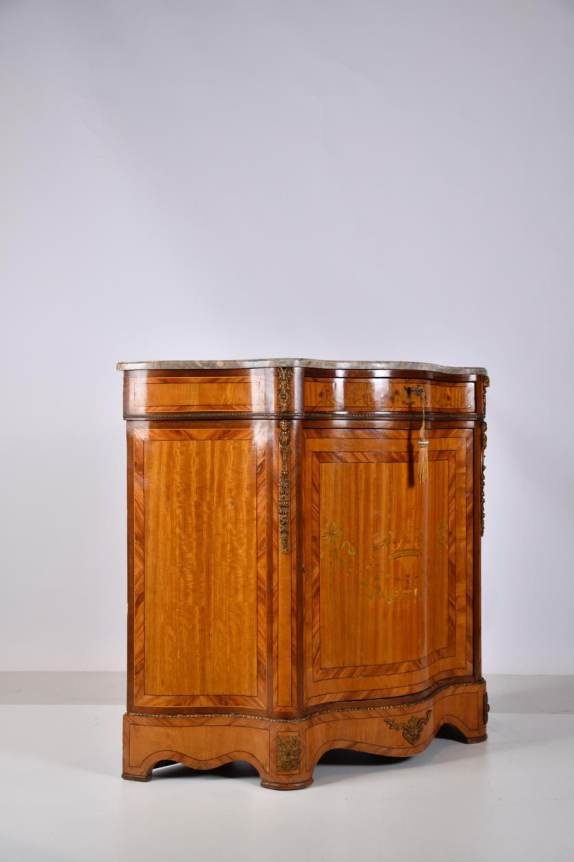 En madera, con superficie chapada y detalles en marquetería de maderas finas. Detalles y aplicaciones en metal dorado.
