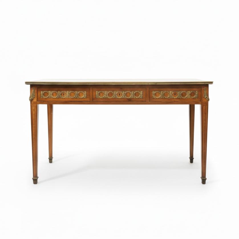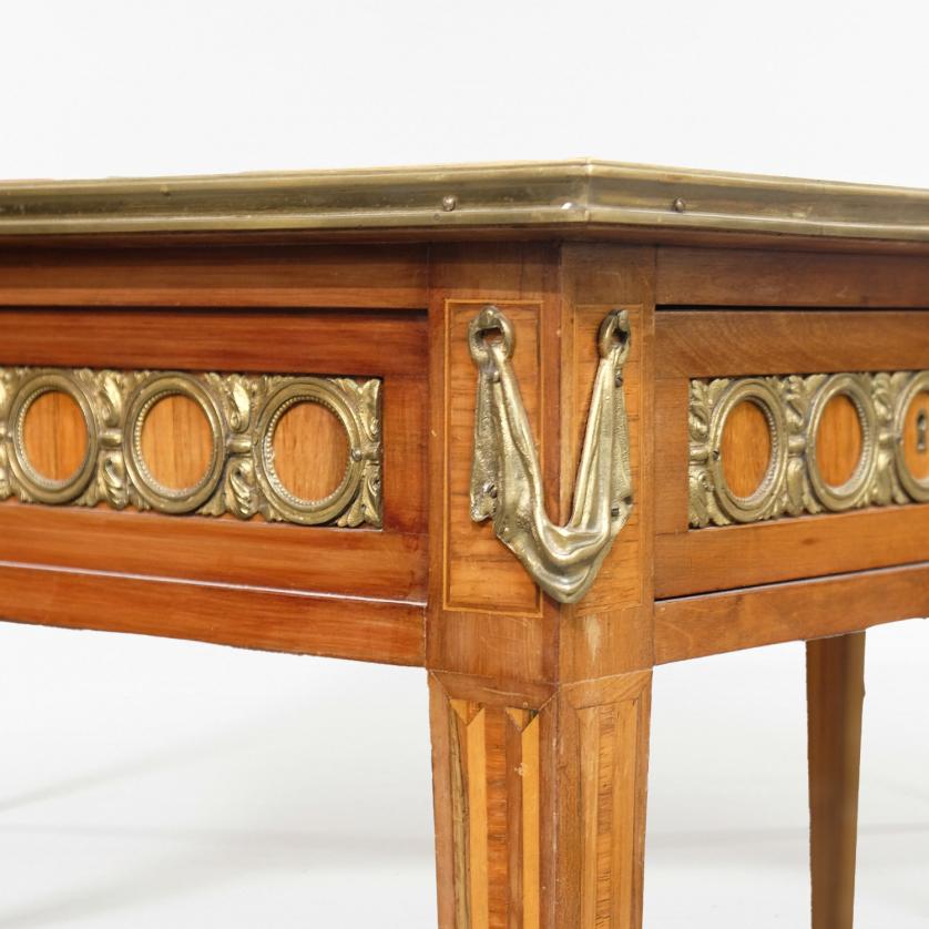 En madera con detalles en marquetería de maderas finas y aplicaciones en metal dorado. Sobre en cuero. Zapatas en latón.