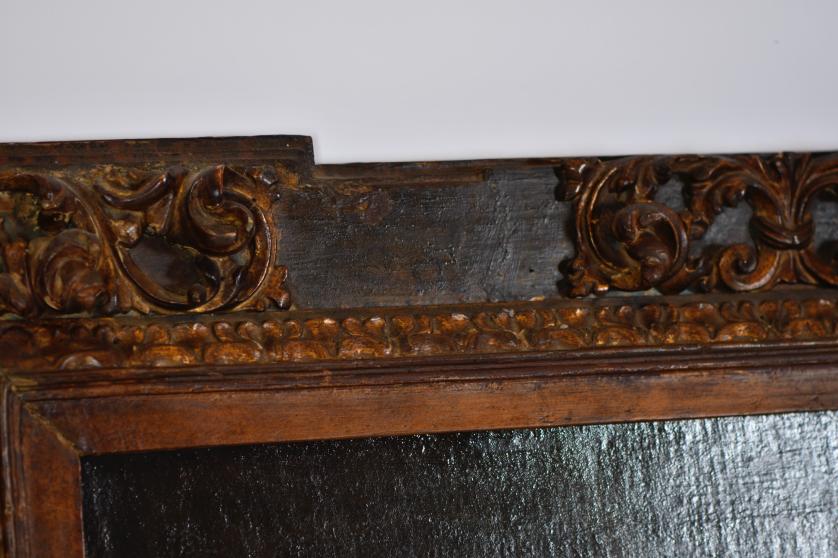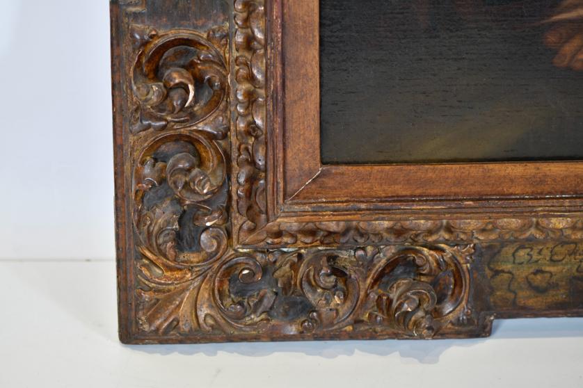 Completa la pintura un elaborado marco barroco en madera tallada que aún conserva restos de policromía.