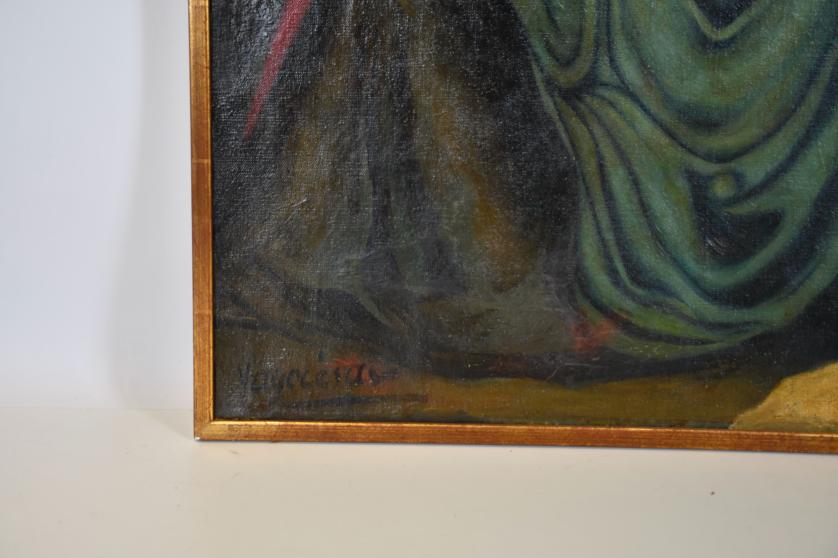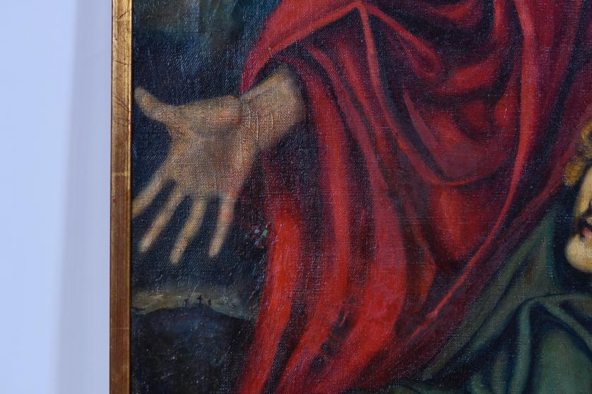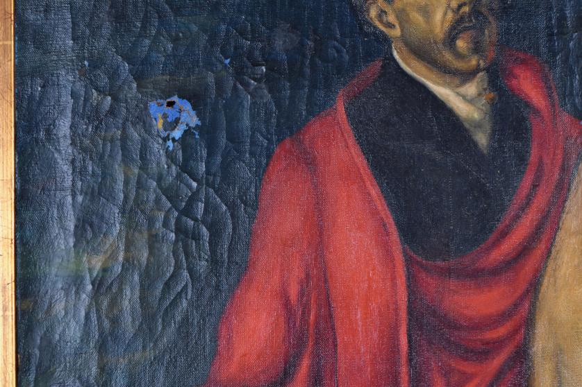 Presenta múltiples restauraciones de la tela visibles al dorso, así como una rotura e intervenciones en la capa pictórica.