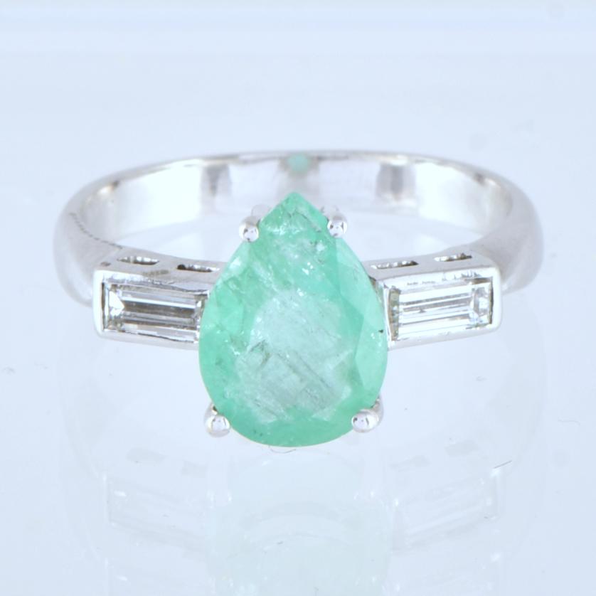 En oro blanco de 18 kt. Diamantes talla baguette. Esmeralda talla pera.