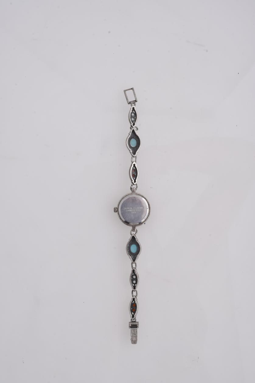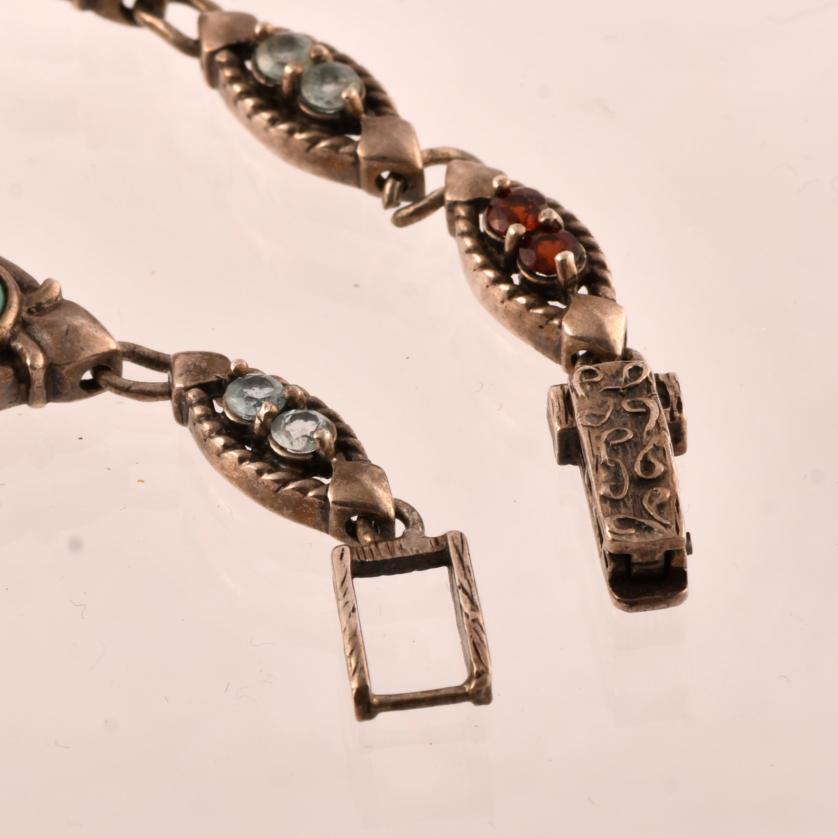 Incrustaciones en la correa de turquesas, granates y turmalinas.
