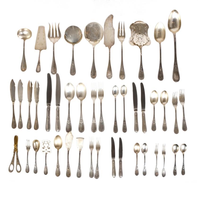 Consta de 12 cucharas soperas, 12 tenedores grandes, 14 tenedores pequeños, 12 tenedores de postre, 12 tenedores mini, 13 cucharas postre, 12 cuchillos grandes, 12 cuchillos postre, 12 cuchillos lunch, 18 palas de pescado-marisco, 12 palas pescado, 12 cucharas helado, 11 cucharas postre, 10 cucharas pequeñas.