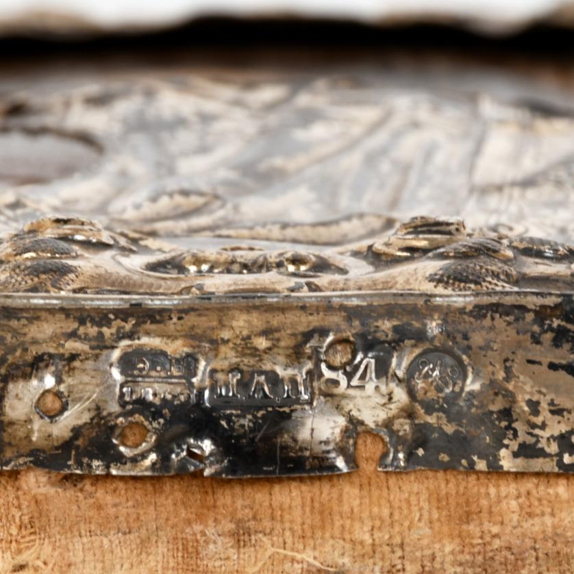 Incluye punzones con la siguiente información: fecha, corresponde a 1860, punzón de plata (84), origen (San Petersburgo) y orfebre.