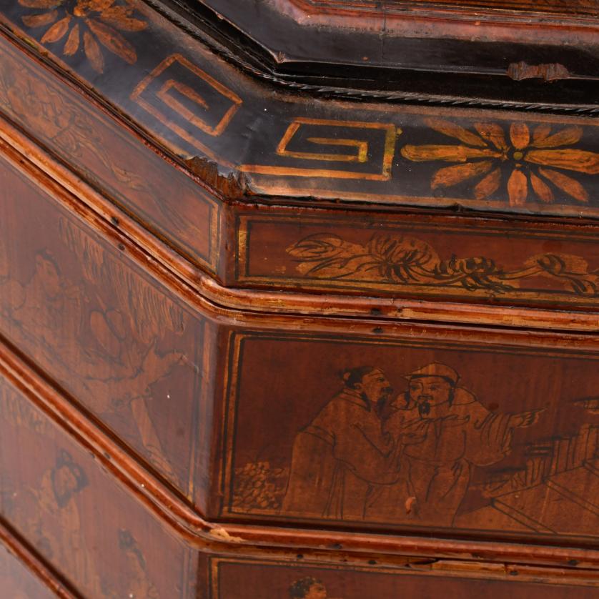 En madera lacada y bambú. Dos de ellas decoradas con escenas cortesanas.