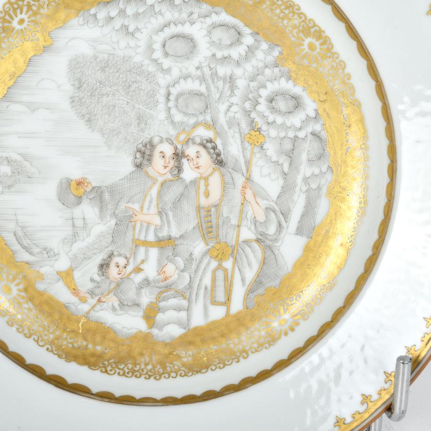 En porcelana decorada en grisaille. Pintado y dorado a mano.