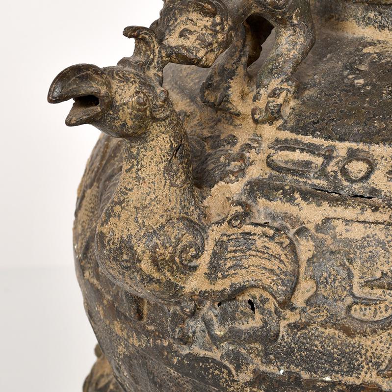 En bronce pavonado con decoraciones geométricas e ideogramas.