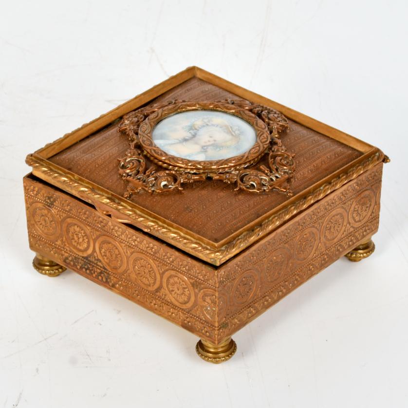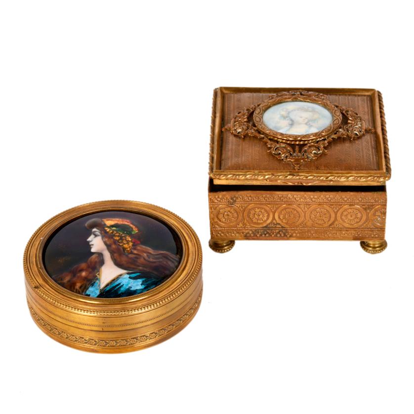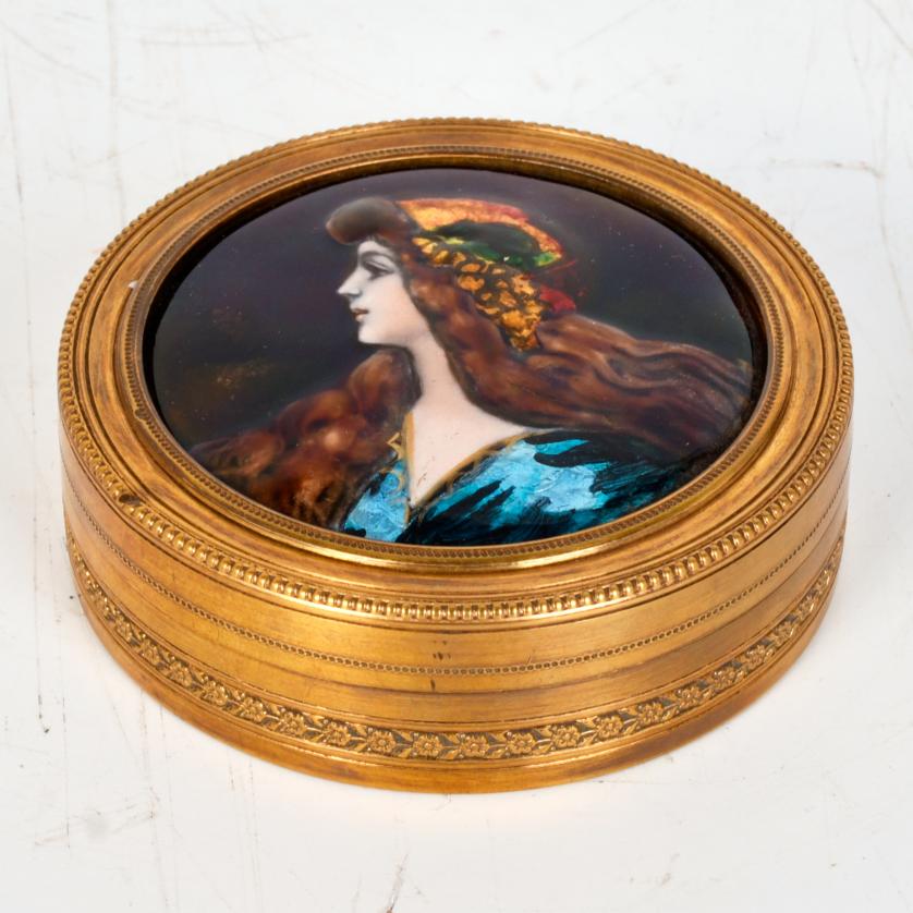 En bronce sobredorado con trabajo en filigrana y medallones en esmalte.