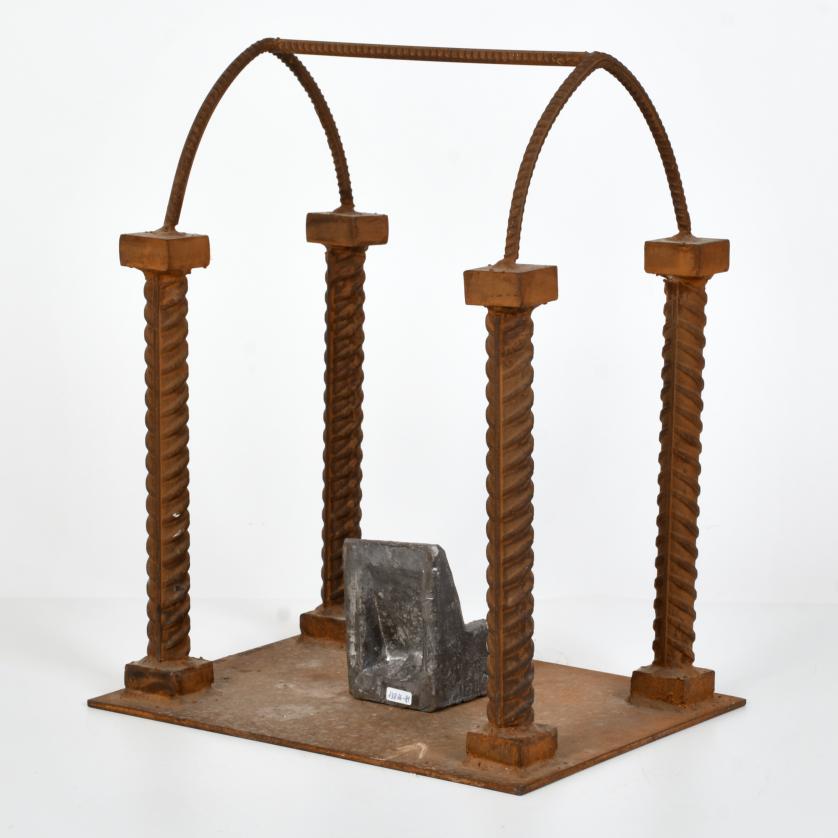 En hierro forjado y hierro. En forma de vuelta ojival con trono en el medio