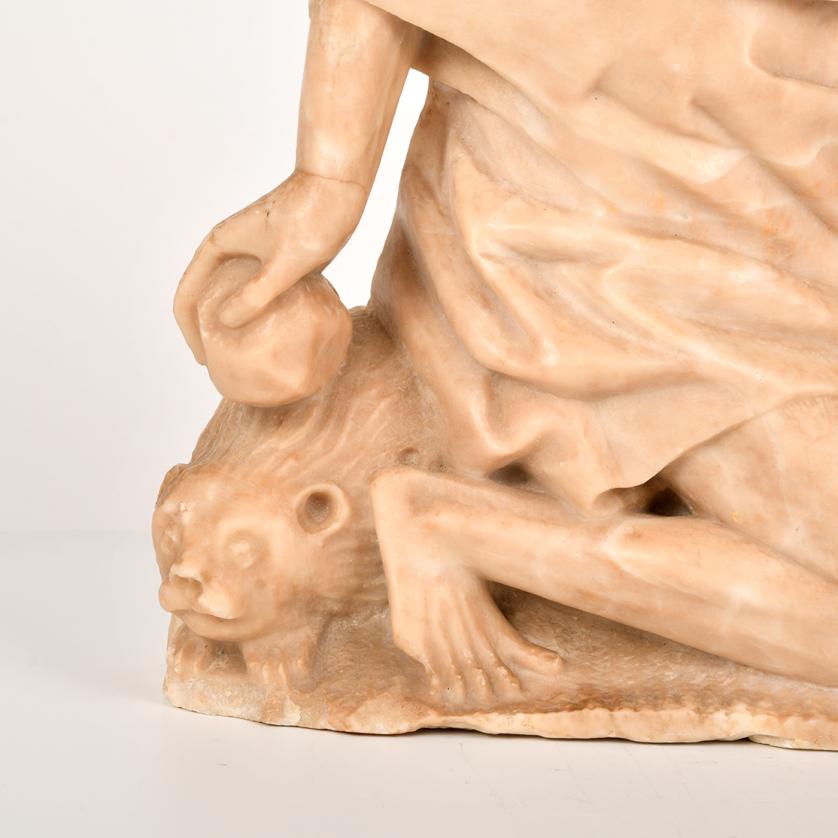 En alabastro. Representación de San Jerónimo con sus atributos (león, piedra y sombrero). En un bajo relieve, probablemente extraído de un relieve mayor.