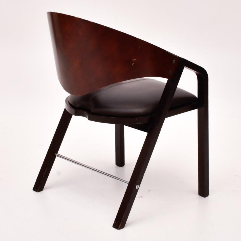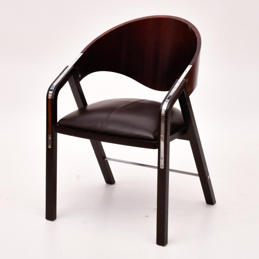 Sillón en nogal oscuro, tapizado con símil de piel de color negro. Herrajes en níquel plateado.