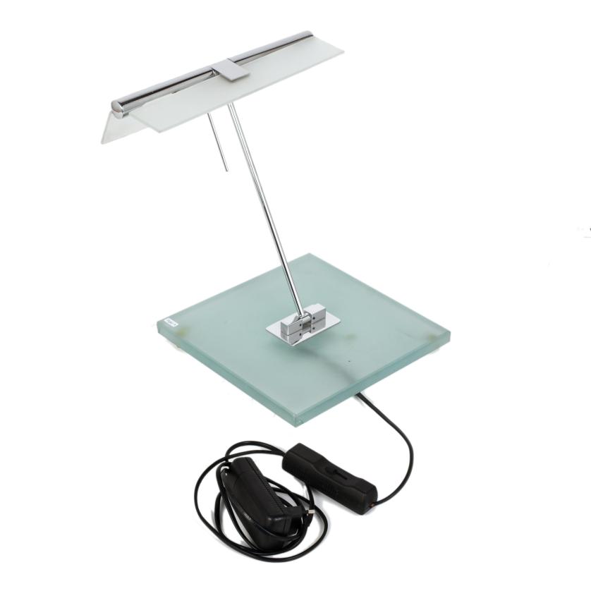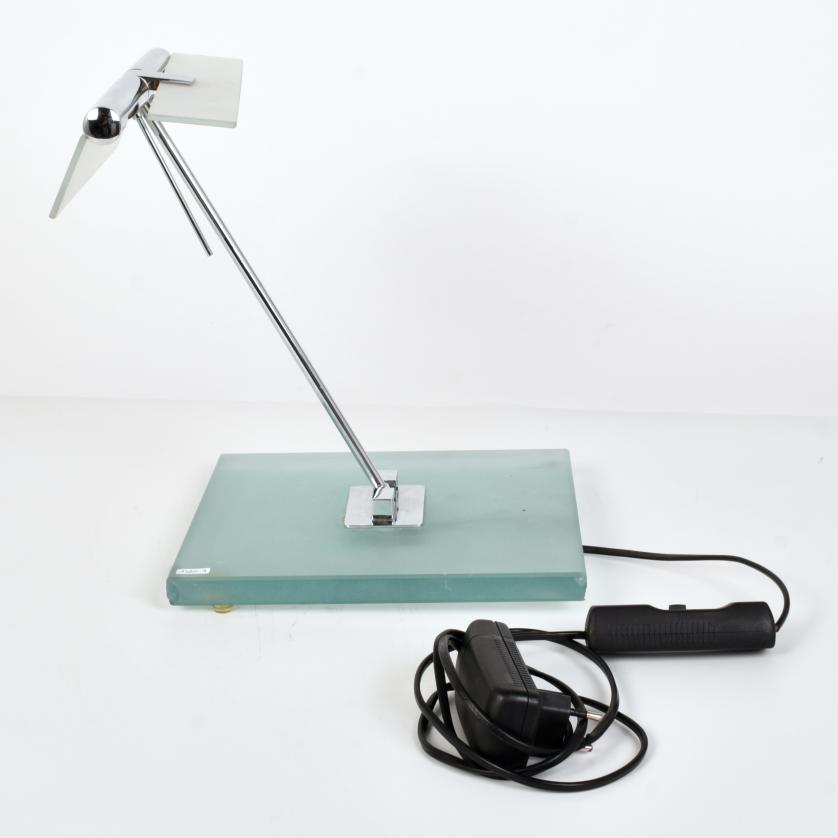 Lámpara de sobremesa metálica y oscilante con pantalla y base en cristal al ácido.