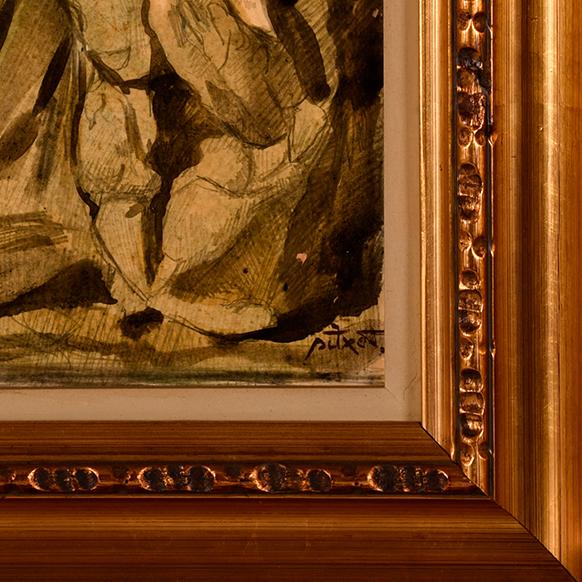 Carboncillo y acuarela sobre papel adherido a cartón.
