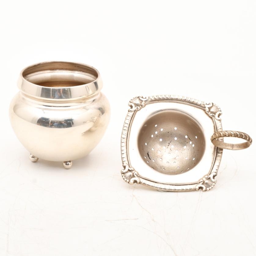 Consta de cafetera y tetera, lechera, azucarero y colador.