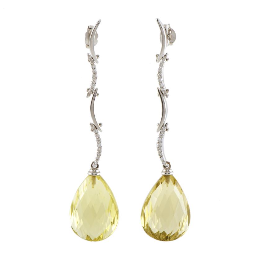 En oro blanco de 18 kt. Topacios verdes talla pera multifacetada.