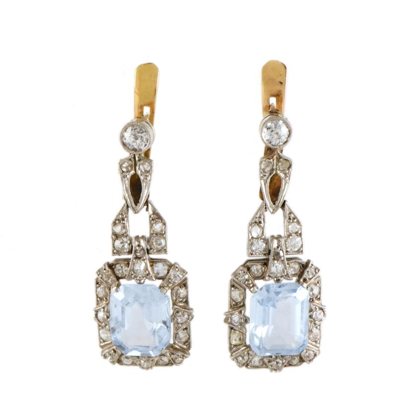113. Pendientes largos art déco con piedra azul y diamantes.