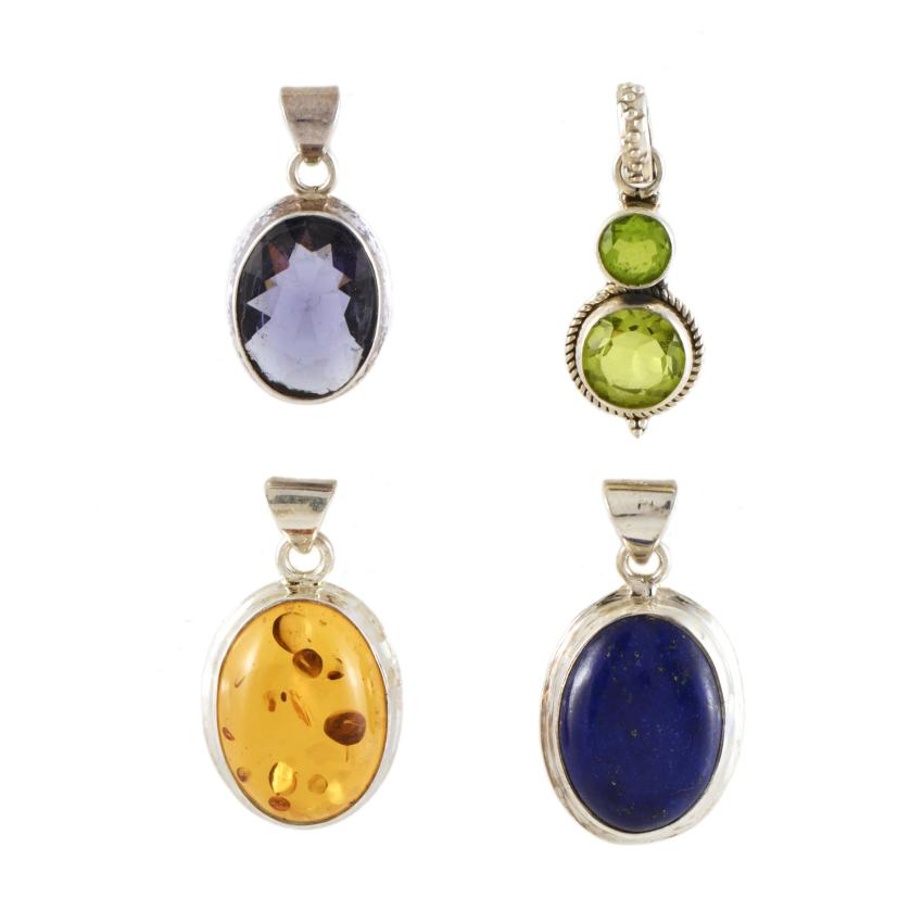 158. Lote de cuatro colgantes de: ambar, lapislázuli, olivina y amatista.