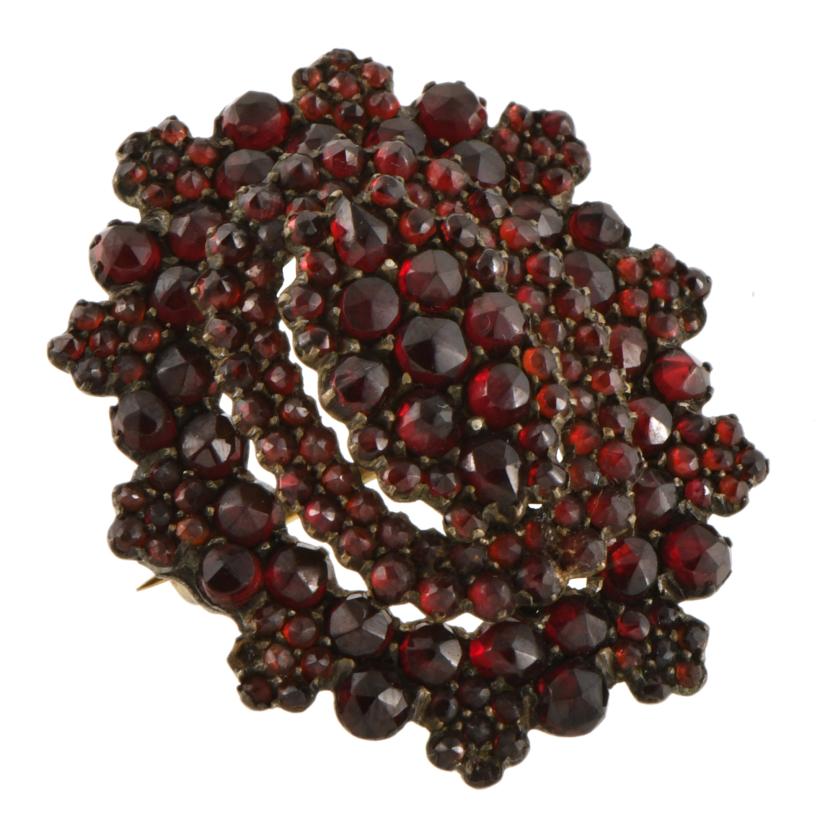 207. Conjunto de pulsera colgante y broche en formas florales con granates.