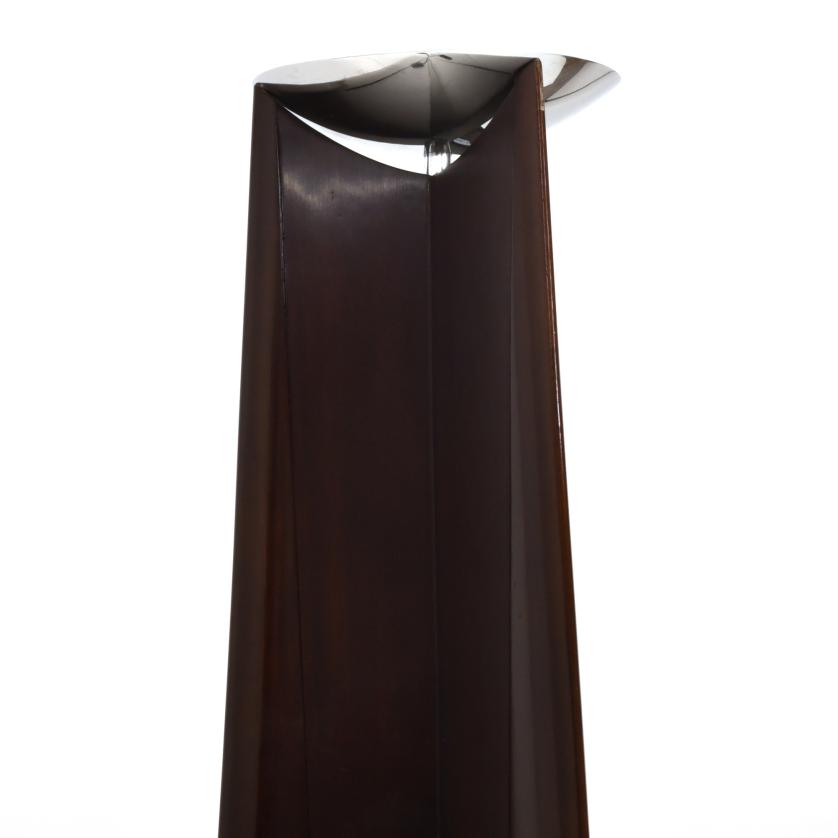 En madera exótica, de la familia de las caobas, detalles en metal plateado.