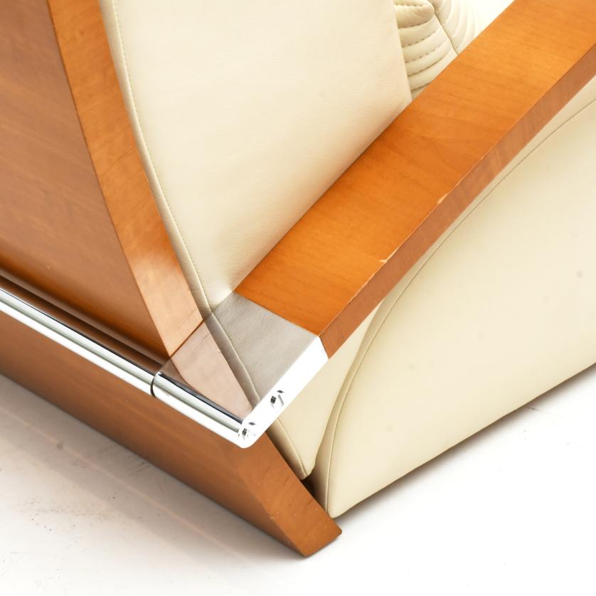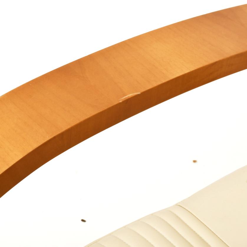 Estructura en nogal claro, herrajes en níquel plateado, tapizado en piel color crema.