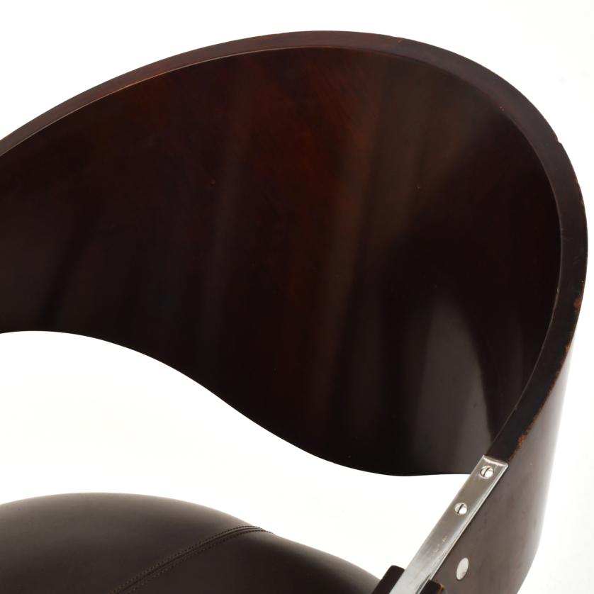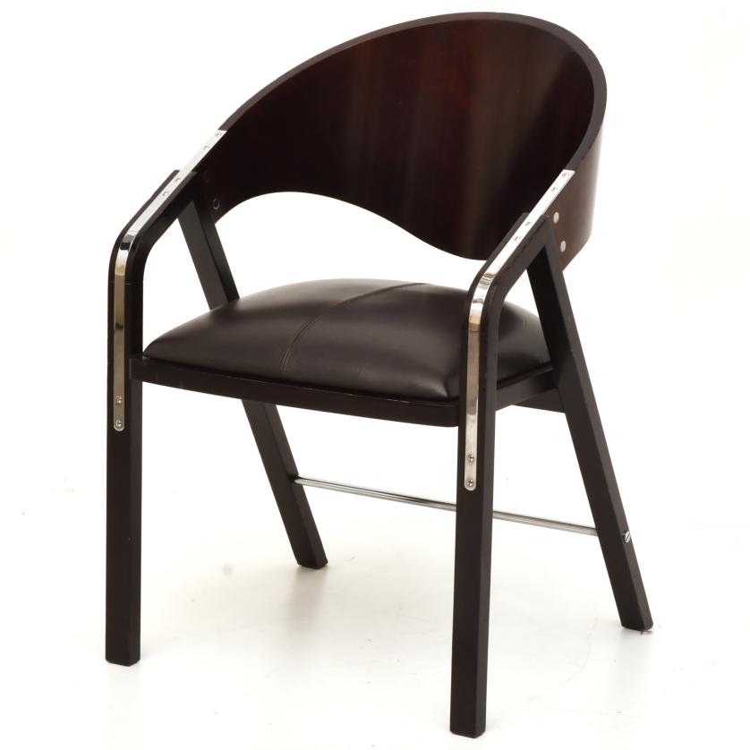 Sillón en nogal oscuro, tapizado con símil de piel de color negro. Herrajes en níquel plateado.