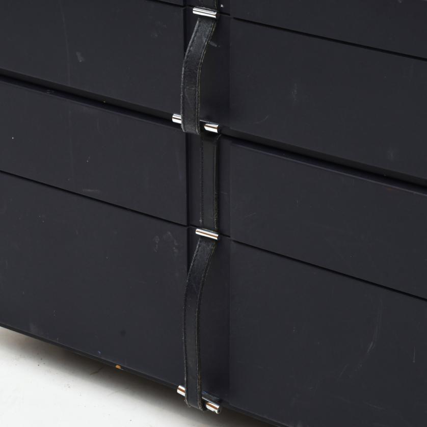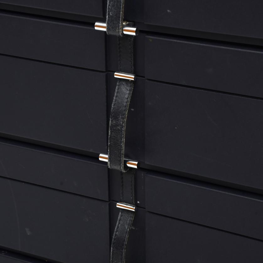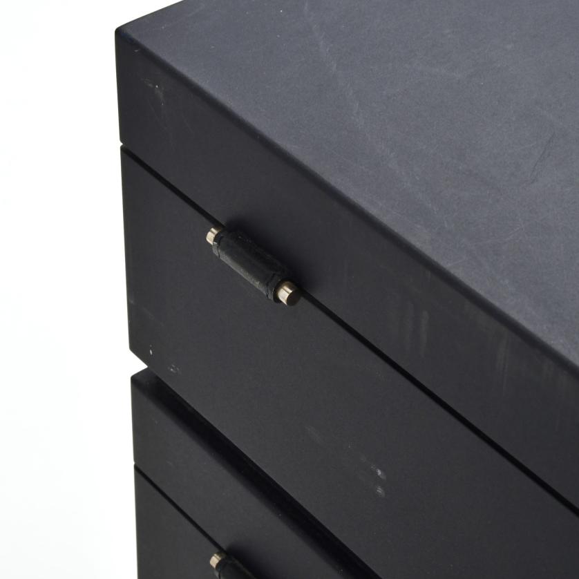 En contrachapado tintado y tiradores en piel de color azul marino.