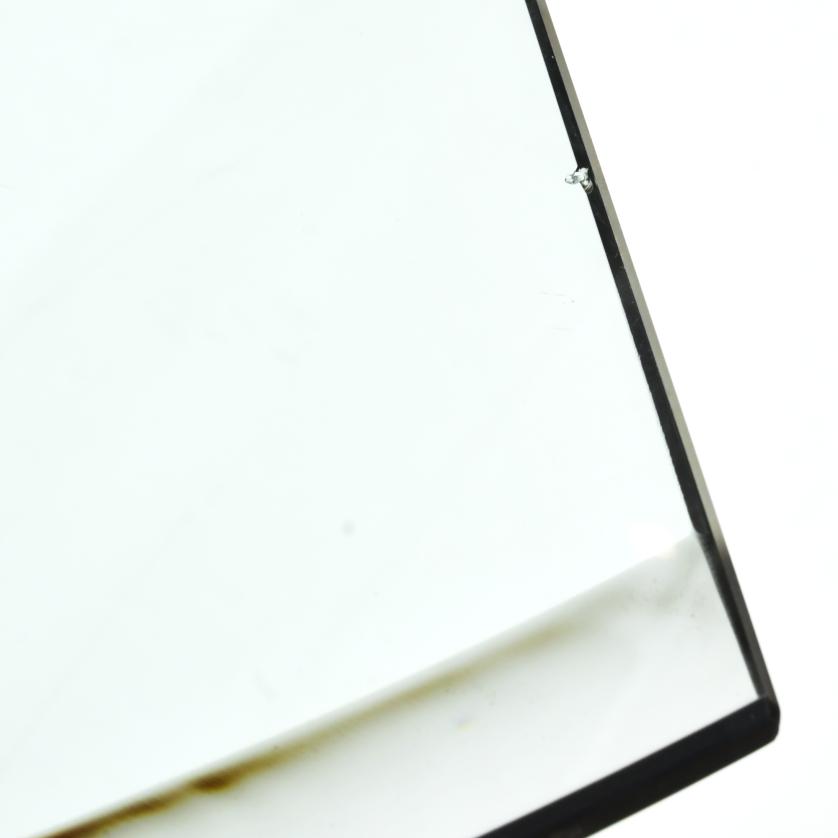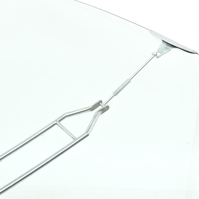 En madera de nogal claro, herrajes en níquel brillo y sobre de cristal transparente de 15mm, con los extremos biselados.