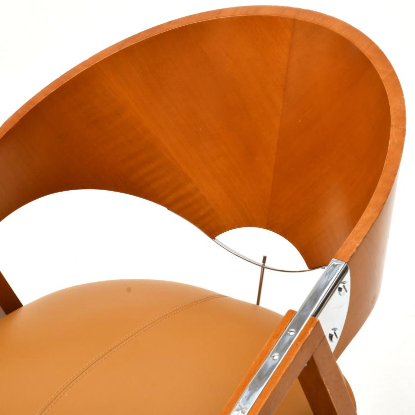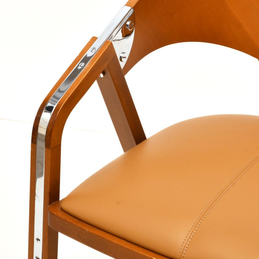 Sillón en nogal claro, tapizado con símil de piel de color beige oscuro. Herrajes en níquel plateado.