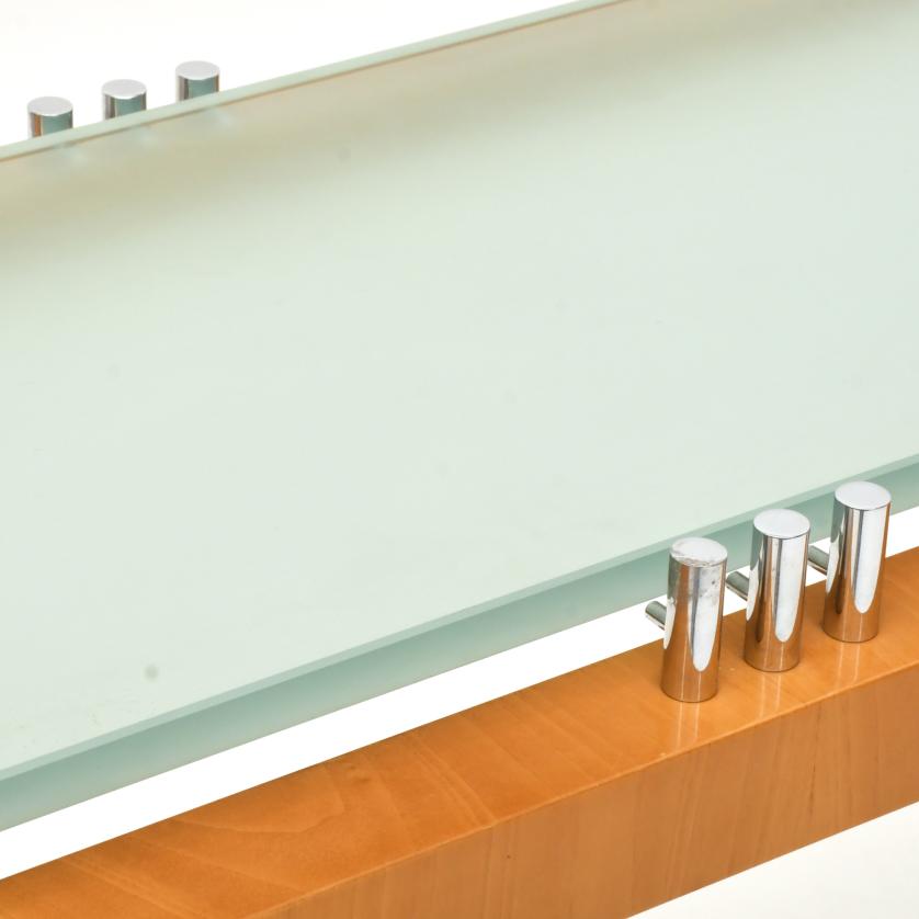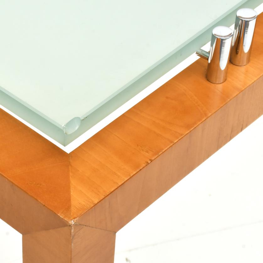 En madera de nogal claro con detalles con níquel brillo. Sobre de cristal grabado al ácido.