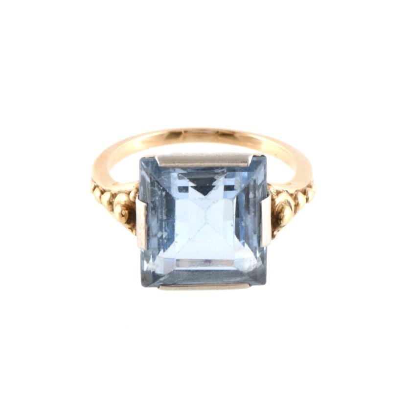 En oro amarillo de 14 kt. Aguamarina talla rectangular.