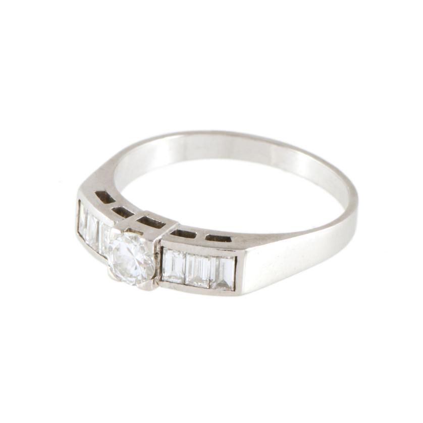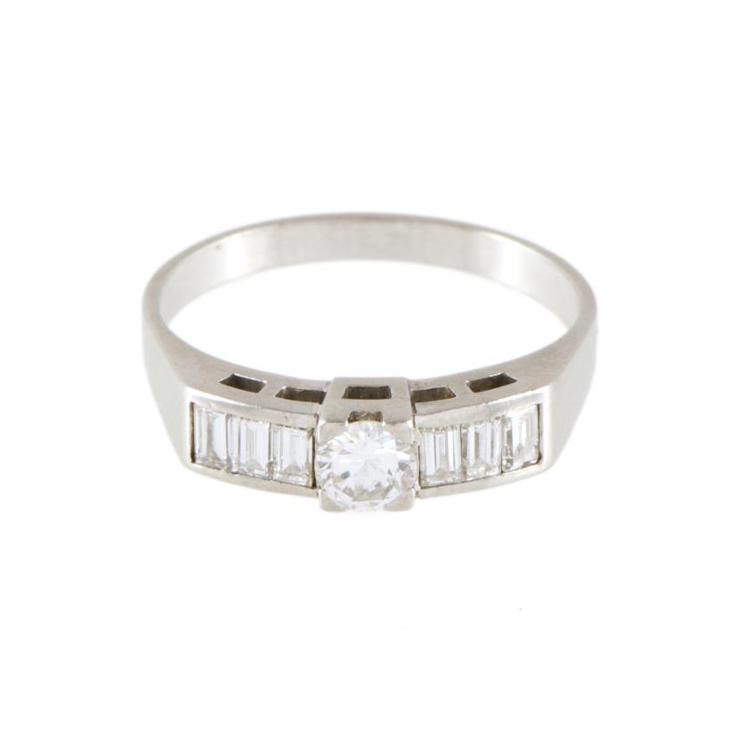 En oro blanco de 18 kt. Diamante central talla brillante de 0.25 kt. y diamantes talla baguette.
