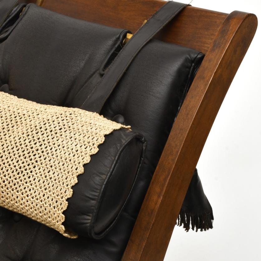 Madera de roble tintada con tapizado capitoné en cuero color negro.