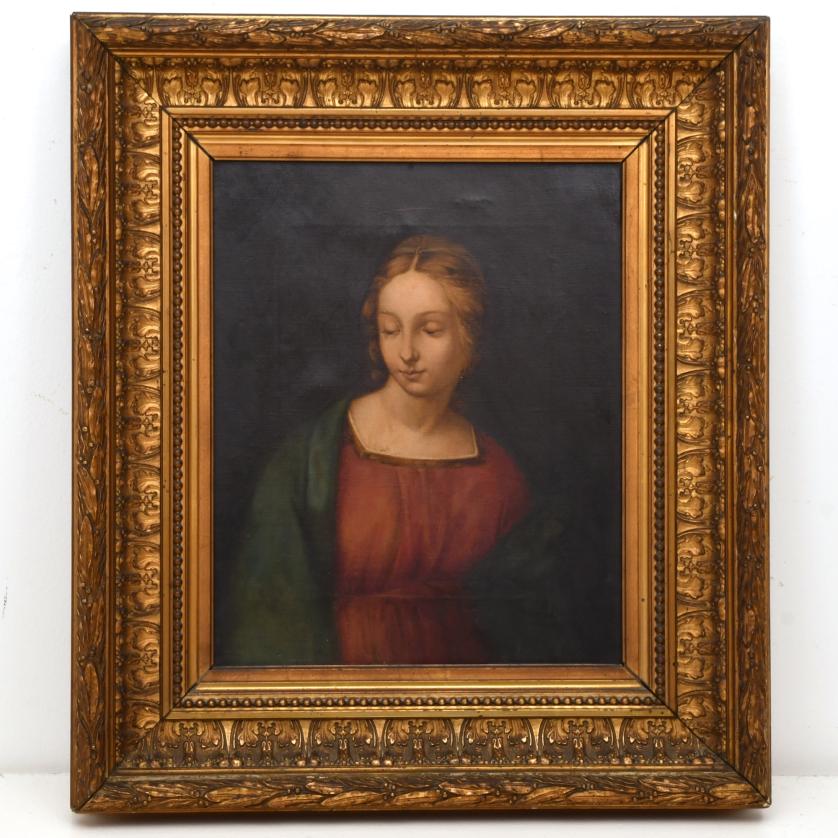 611. ESCUELA, PROBABLEMENTE ITALIANA,SIGLO XIX. "Retrato de la Virgen", a partir de la obra original del Rafael Sanzio "La virgen del jilguero".