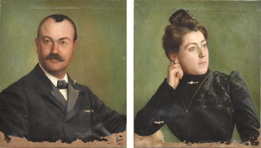 670. ESCUELA ESPAÑOLA, PPS. SIGLO XX. Pareja de retratos de matrimonio.