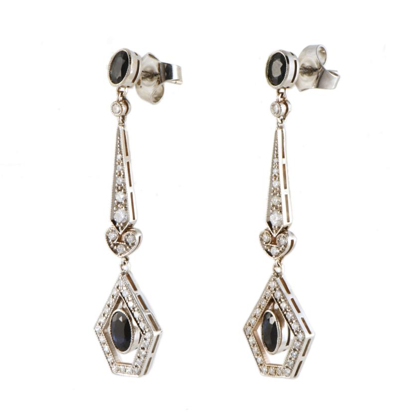 70. Pendientes largos estilo art déco con diamantes y zafiros.