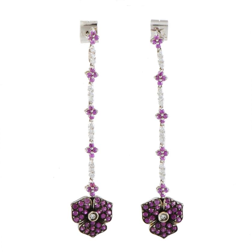 74. Pendientes largos en forma de flor con diamantes rosas.