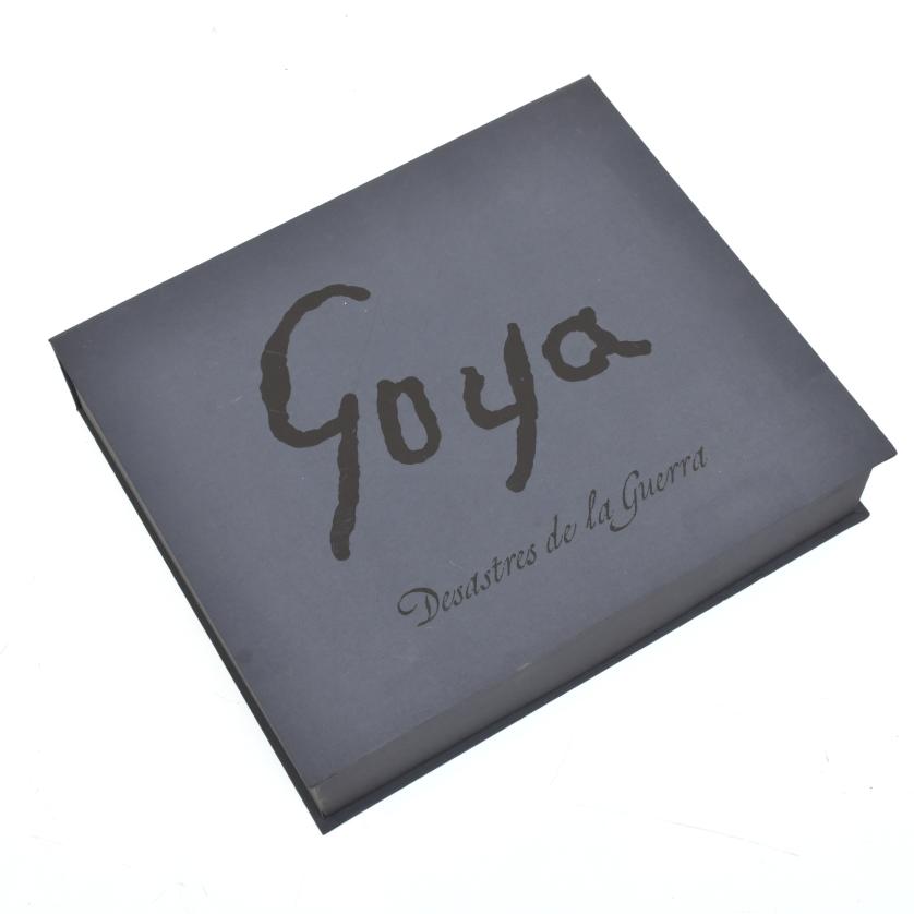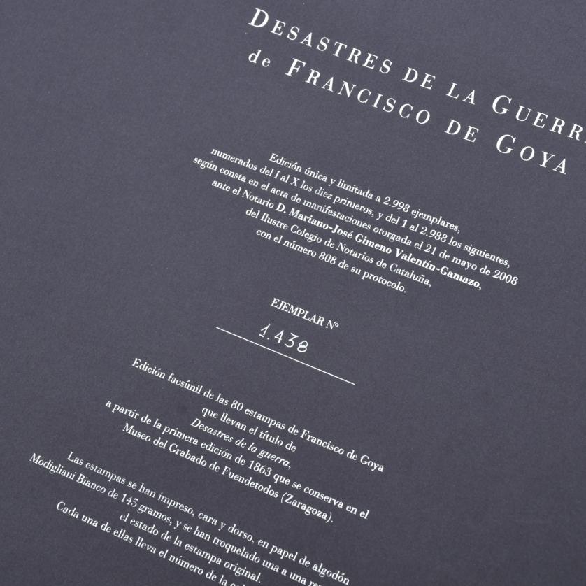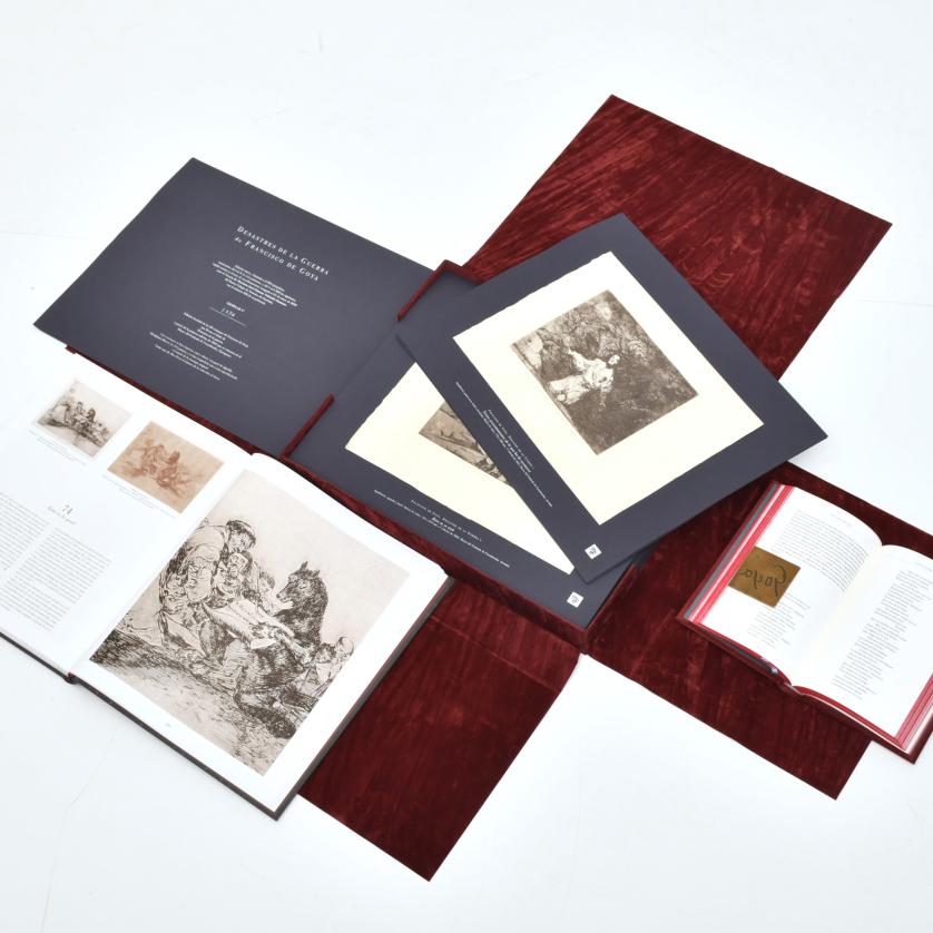 Testigos de una época 1808-1814, en terciopelo, 348 páginas con los cantos tintados, 22 x 14 cm. Placa de bronce con la firma de Goya grabada. Estuche forrado en terciopelo rojo que contiene en edición facsímil las 80 estampas de Francisco de Goya que llevan el titulo de Desastres de la guerra, a partir de la primera edición de 1863 que se conserva en el Museo del Grabado de Fuendetodos. Cada una de ellas lleva el número de la colección al dorso. Edición numerada y limitada da 2998 ejemplares, éste corresponde al 1438.