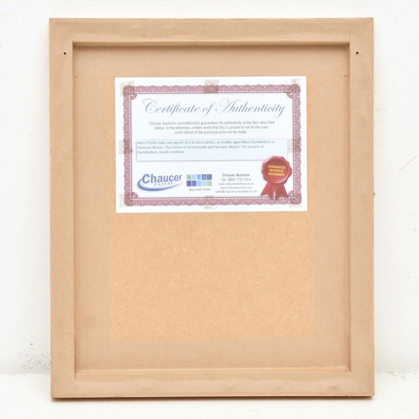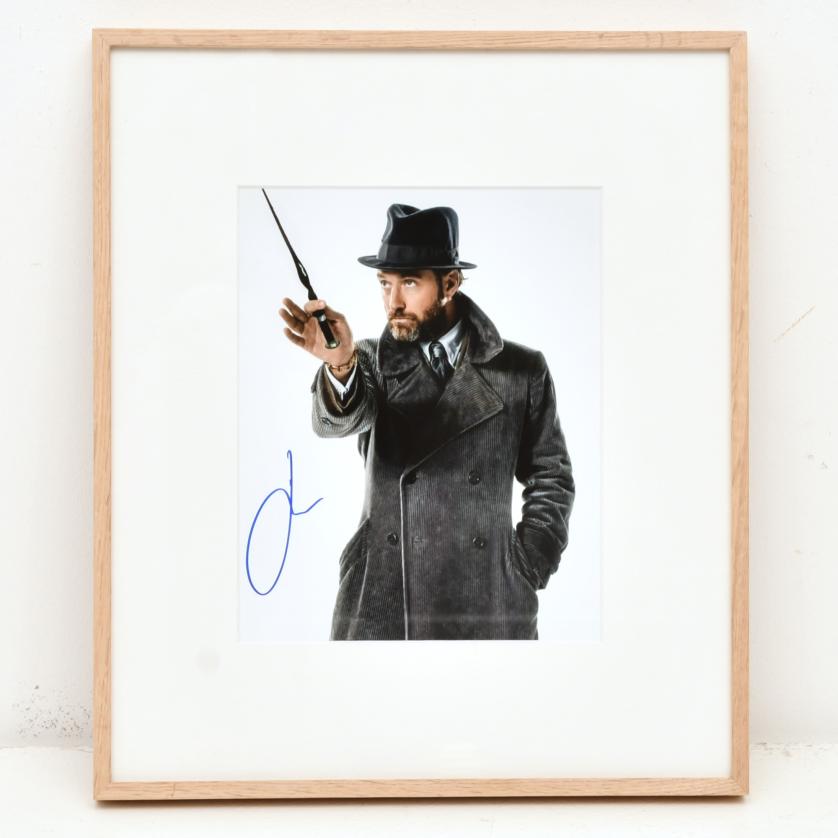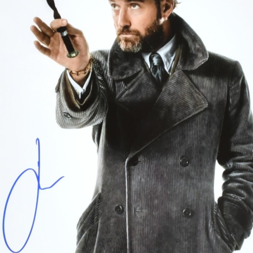 Se adjunta certificado de autenticidad. Fotografía promocional del personaje Albus Dumbledore firmada por el actor Jude Law, en la película “Animales fantásticos: los crímenes de Grindelwald” (Fantastic Beasts: The Crimes of Grindelwald), dirigida por David Yates (2018). Philippe Rousselot: director of photography.