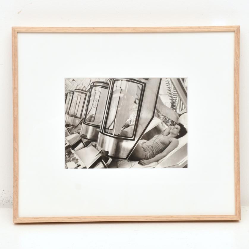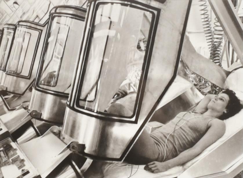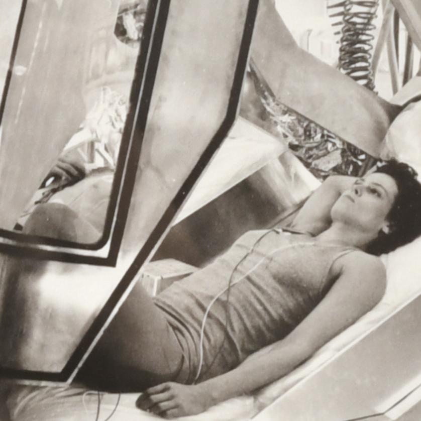 Fotografía de Sigourney Weaver dentro de una de las cábinas durante el rodaje de la segunda parte de la saga Aliens, dirigida por James Cameron (1986).