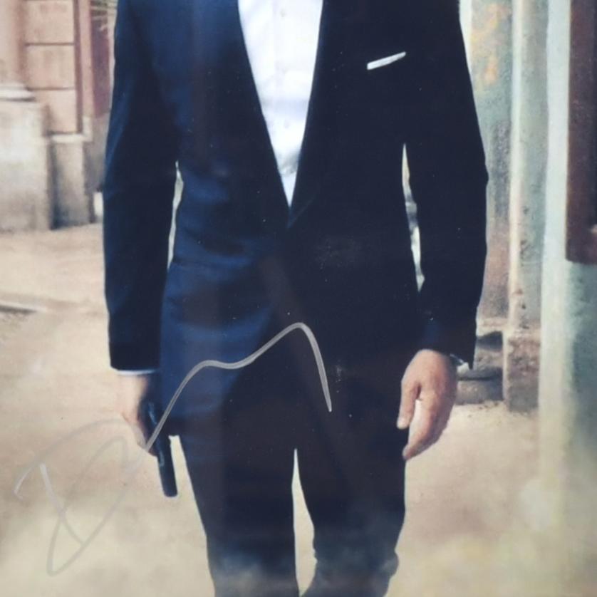 Fotografía firmada por Daniel Craig interpretando a James Bond en “Sin tiempo para morir” (No Time to Die) dirigida por Cary Fukanaga (2021). Esta película representa la quinta y última representación del mítico agente británico por parte de Daniel Craig. James Bond ha llegado a ser interpretado por cinco actores más: Sean Connery, George Lazenby, Roger Moore, Timothy Dalton y Pierce Brosnan. Conocido por sus habilidades sociales y físicas, James Bond representa uno de los personajes ficticios más icónicos de la historia. El agente secreto conocido por su código 007 es Comandante de la Marina Real Británica, aunque también trabaja a nivel internacional, y entre misiones, sigue un alto estilo de vida rodeado del Caviar Royal Beluga y el cóctel Vesper. Concretamente en “Sin tiempo para morir” Bond ha dejado el servicio activo y está viviendo en Jamaica, hasta que la CIA le pide ayuda para rescatar a un científico secuestrado y con Bond persiguiendo a un misterioso villano con peligrosa tecnología interpretado por el oscarizado Rami Malek. La saga de películas ha cosechado un gran número de nominaciones en los Premios Oscar, destacando principalmente en la categoría de Mejor Canción Original con canciones como “Skyfall” de Adele o “Goldfinger” de Shirley Bassey.